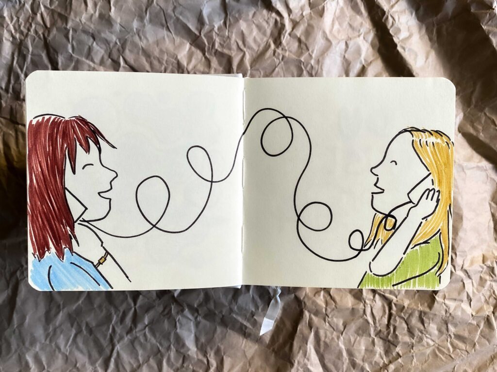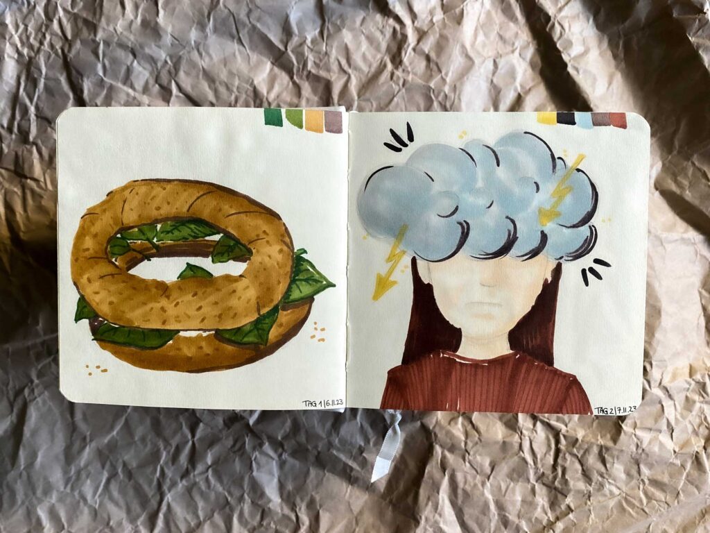 Anfänglich war das schwer: Es war schwer mir täglich die Zeit zu nehmen, obwohl das Büchlein winzig ist und die Seiten damit auch echt schnell zu befüllen sind! Und es war schwer, ein Motiv für die weiße Seite zu finden. Denn häufig war viel Druck dabei, heute noch dafür malen „zu müssen“. Außerdem erschuf ich mir immer wieder Grenzen, wie die Sketche aufeinander aufbauen könnten, welches Thema ich von nun an verfolgen möchte oder mit welchen Stiften ich ab jetzt ausschließlich malen möchte. Doch diese Grenzen musste ich viele Male einreißen. Hilfreich dabei war der tägliche Fotoaustausch. Er schuf eine Verbindlichkeit, mir immer wieder die Auszeit im Alltag einzubauen. Und damit war es ein anstrengendes Training, mir diese wertvolle Kreativzeit zu nehmen. 🙂