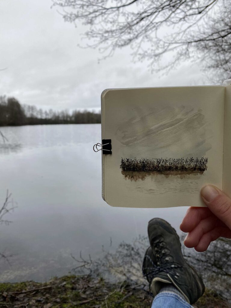 Inzwischen gehört das kleine quadratische Buch zu meinem festen Bestandteil in der Tasche. Es gibt mir Ruhe, wenn ich unterwegs weiß, dass ich jederzeit die Möglichkeit zum Malen habe. Dabei kann ich Gedanken sortieren, sie für einen Moment verlangsamen und mit neuer Energie zurückkommen. Das Blättern durch das Buch ist ein bildlicher Rückblick auf das vergangene Jahr. Ich bin stolz, die 100 erreicht zu haben und auch ehrlich damit einverstanden zu sein, nicht jeden Tag gemalt zu haben. Die Zahl war das Ziel und dabei habe ich viel über Regelmäßigkeit, Durchhaltevermögen und was Malen für mich bedeutet gelernt.