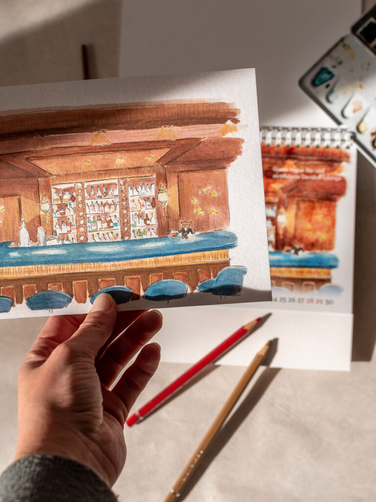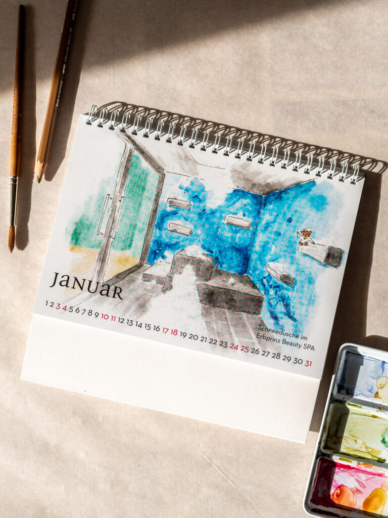 Nach einiger Wartezeit startete das Projekt im Sommer. Wir legten die Zimmer fest, entschieden über die Motivabfolge in den Monaten und dann ging es los. Kalenderblatt für Kalenderblatt entstand auf A5 Aquarell Papier. Zuerst eine Bleistiftskizze, dann die Konturen und schließlich die Farbe. In jedem Bild taucht ein kleiner Teddybär auf, der das Maskottchen des Hotels ist. Mit Holzbuntstiften und etwas digitaler Magie arbeitete ich die Details der Bilder aus, sodass sie von der Partnerdruckerei des Hotels gedruckt werden konnte.