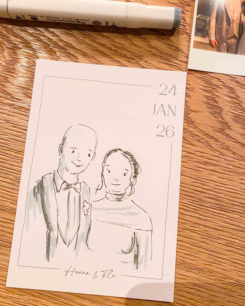 Meine erste Buchung als Live Zeichnerin auf einer Hochzeit lief ganz unkompliziert ab. Das Brautpaar entdeckte meinen Flyer in dem Restaurant in dem sie bald heiraten würden. Sie nahmen Kontakt mit mir auf und bei einem Telefongespräch war schnell klar, dass die Stimmung zwischen uns passt. Wir besprachen die Anzahl der Gäste, den Ablauf der Feier und wie die Live-Porträts am Ende verwendet werden sollten.