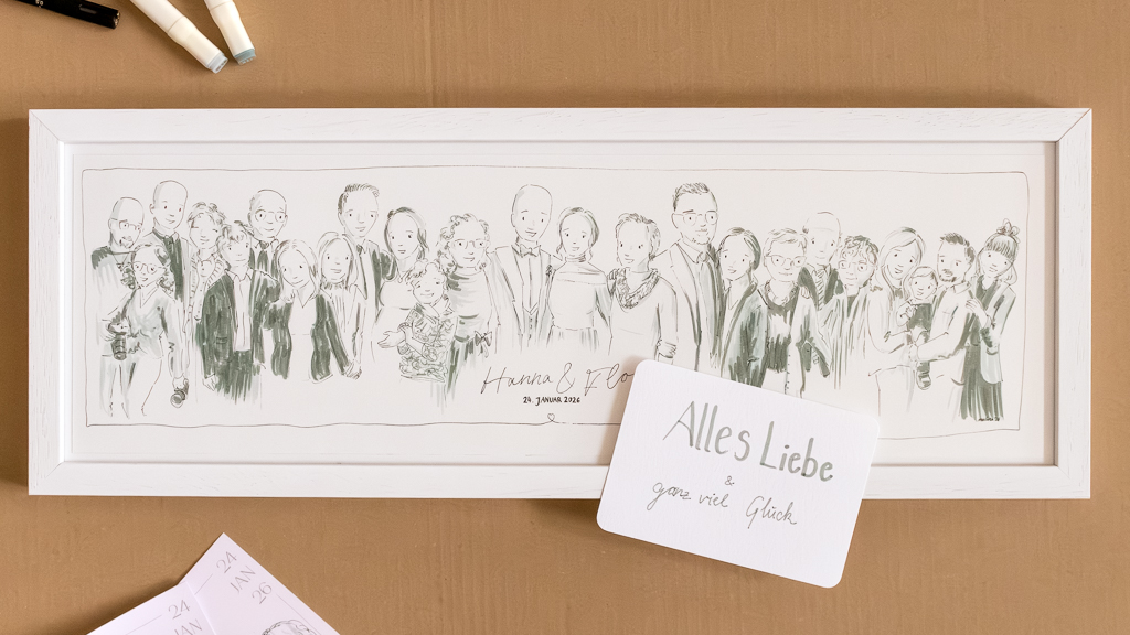 Doch auch ihr als Paar könnt eine bleibende Erinnerung erhalten. Gerne erstelle ich euch im Anschluss eine Gästecollage im selben Stil, wie die Live Porträts. Auf Wunsch kann sie um Personen ergänzt werden, die an eurem Hochzeitstag leider nicht dabei sein konnten. Während dem Zeichnen versetze ich mich zurück in den Tag und so schwingt in der Collage in jedem Fall die Stimmung eurer Feier mit. Sie bleibt sichtbar, auch lange nach eurer Hochzeit.